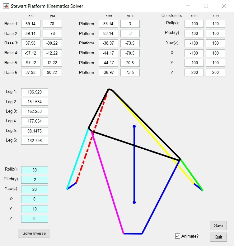 MATLAB 和Processing 的仿真环境用于对Stewart 平台问题进行建模,采用GUI界面进行控制 MATLAB 模型用于绘制腿部驱动图。 该代码可以确保真实的模拟器腿不会超过操作范围内的最大偏移。