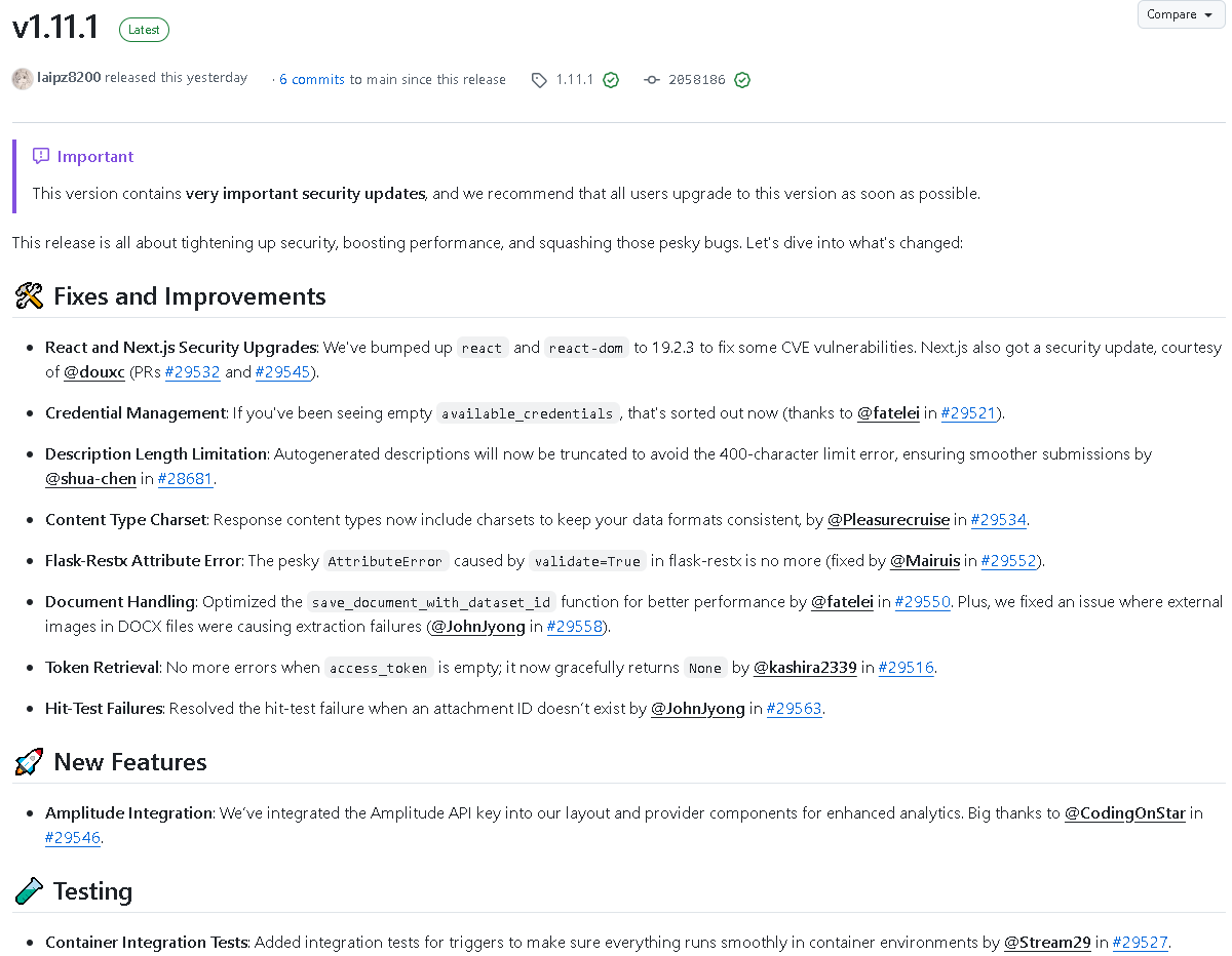 2025年12月12日,dify 发布了 1.11.1 版本。这次更新包含了非常重要的安全补丁、性能提升以及若干 Bug 修复,官方强烈建议所有用户尽快升级到该版本,以保障系统的安全与稳定。
