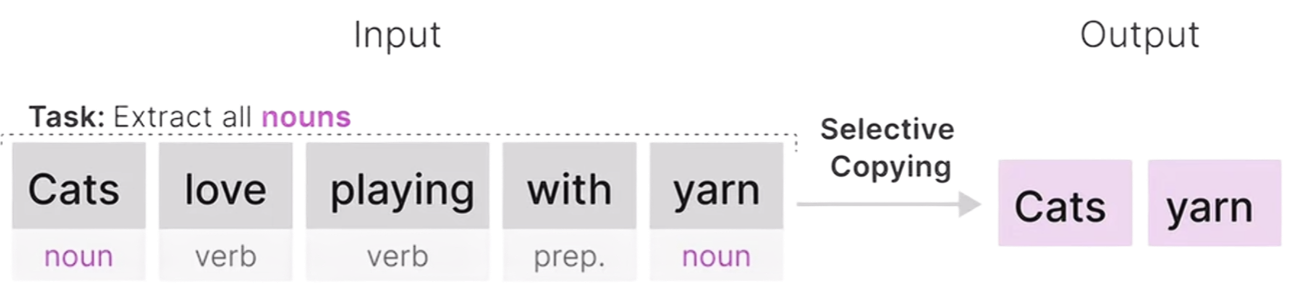 以下面的任务为例,模型需要从输入中有选择地提取所有的名词,理想情况下是输出Cats和yarn,但是S4可能做不到。
