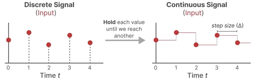 离散化常采用零阶保持技术。其具体做法是:在接收到离散信号的某个采样值后,立即更新输出信号为该值,并且在到达下一个采样时刻之前,始终将此值保持不变,形成一个"阶梯"状的波形。相邻阶梯之间的时间间隔,就是可学习的步长Δ。这个过程是为了给后续的连续系统提供一个可处理的、分段恒定的输入。