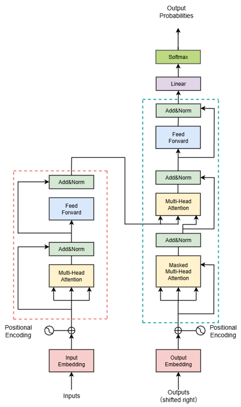 Transformer 的核心架构以自注意力机制为核心,彻底摆脱了循环神经网络的串行依赖,实现了序列数据的并行化处理。其整体结构如下图所示,由编码器(Encoder)和解码器(Decoder)两部分组成。
