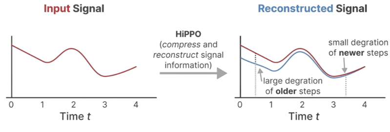 下面的波形图体现了Hippo矩阵的作用------重建信号能有效保留近期输入,同时对更早期的信号进行合理的"遗忘"。