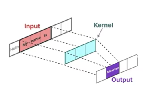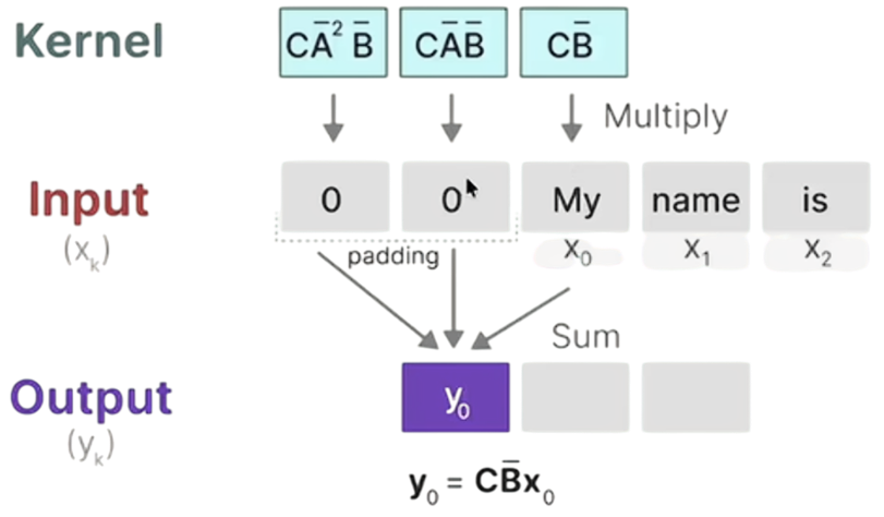 相比于传统卷积的局部运算,S4采用了全局卷积,每个输出位置都依赖于整个输入序列。在下图的文本生成任务中,输入是"My name is",长度为3,这三个单词分别可以表示为x0、x1、x2,卷积核的大小也为3。