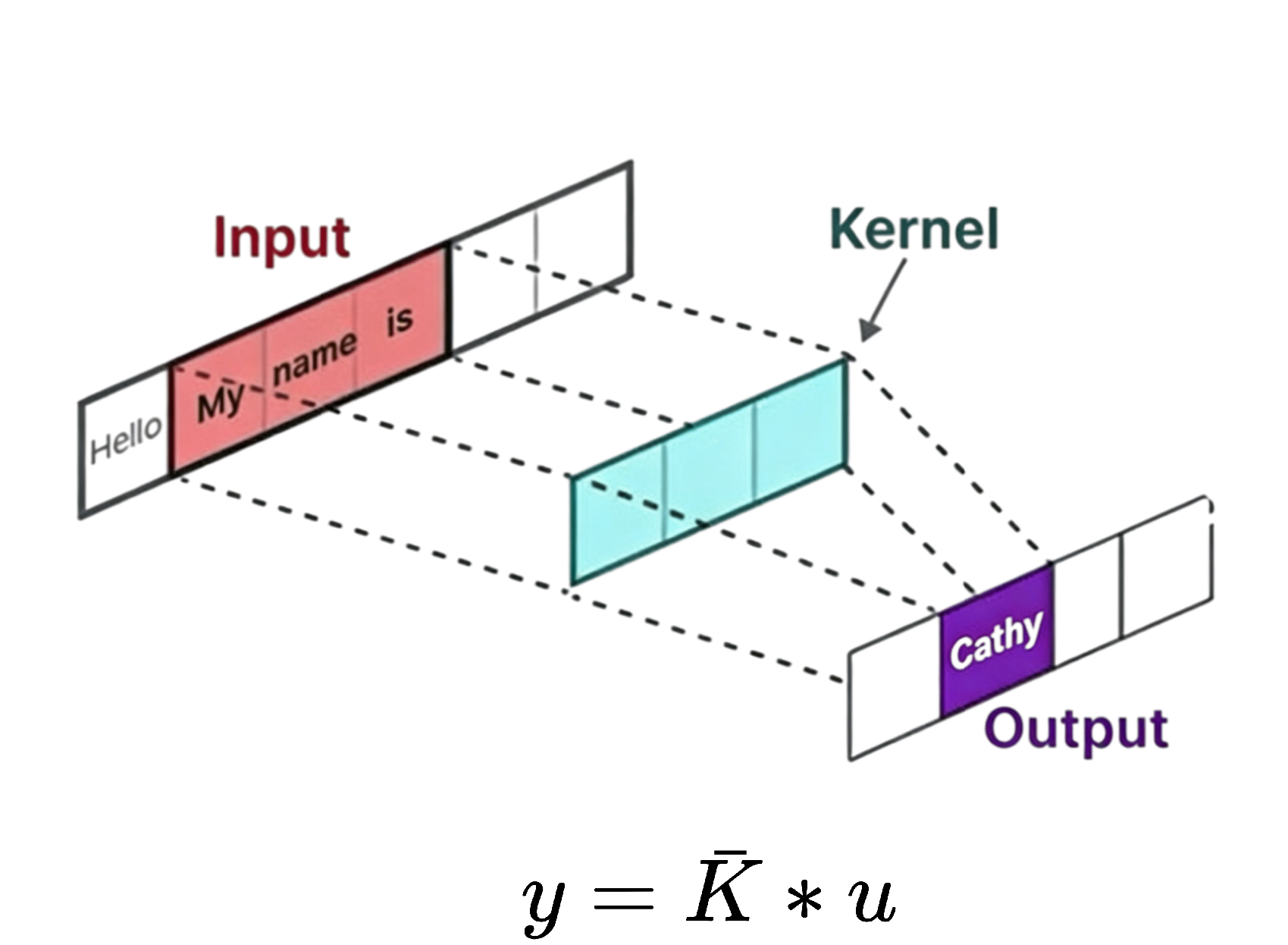 输入序列u通过与一个结构化的一维卷积核进行卷积操作,将递归运算转化为卷积操作,最终得到输出序列y。