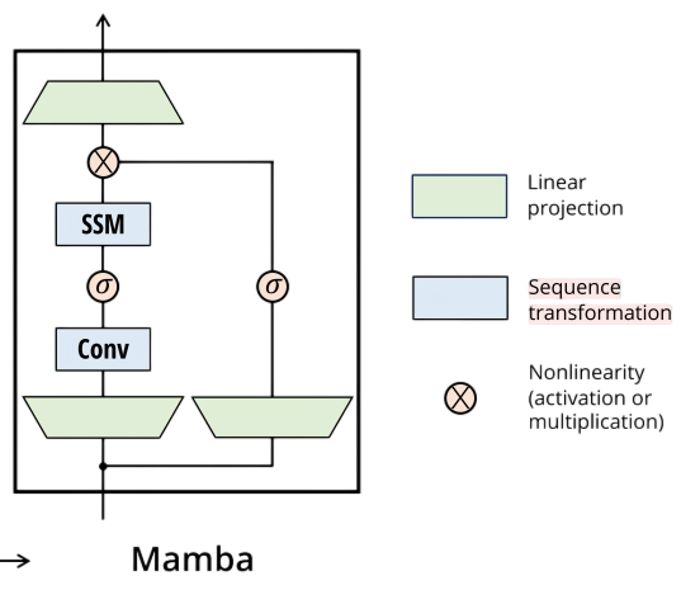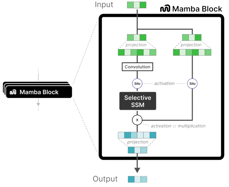 其工作原理是一个循环处理过程:输入首先进行输入投影,将输入序列映射到适合选择性SSM模型处理的维度。接着数据分为两路,一路通过一个卷积模块来捕获局部特征,之后通过SiLU激活函数引入非线性。另一路数据经过另一个线性层,再经过Sigmoid函数,生成门控信号g。最后,SSM路径的输出与门控信号g进行逐元素相乘,结果再经过输出投影,产生Mamba Block的最终输出。