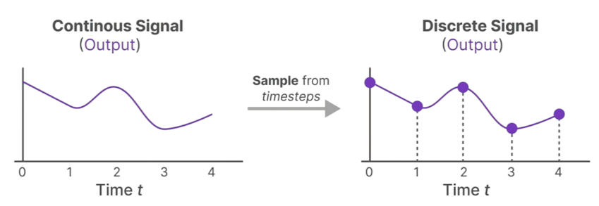 在输出阶段,我们需要从一个连续的系统输出信号中,通过采样得到我们最终需要的离散的输出信号。其具体做法是:在模型处理完连续的输入信号后,会产生一个连续的响应曲线。为了能在数字系统中使用这个结果,我们仅在特定的、与输入对齐的时间步长处(如图中t=0, 1, 2, 3, 4的时刻)对这条连续的输出曲线进行测量,提取其瞬间的值。这些被提取出来的离散点,就构成了模型的离散输出序列,完成了从连续域到数字域的转换。