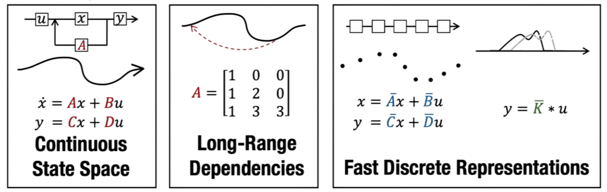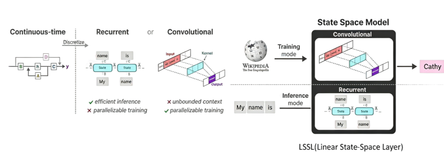 线性状态空间层则结合了两者优势:训练阶段用卷积形式,推理阶段切换为递归形式,以此兼顾训练效率与推理时的长上下文需求。
