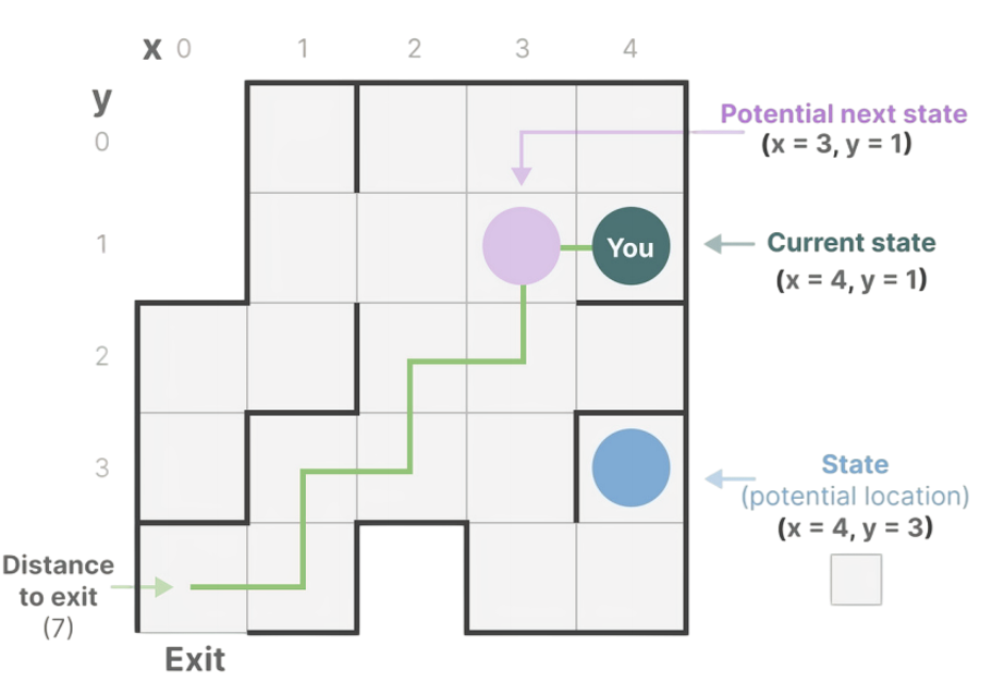 状态空间是描述一个系统所需的最少状态数量,下图的迷宫即为一个动态系统,状态空间则是这个系统中所有可能状态的集合------每个状态由当前位置坐标(xi,yj)、可能的下一位置(xi',yj')可执行的动作(上下左右移动)、以及到达目标的距离等信息组成。