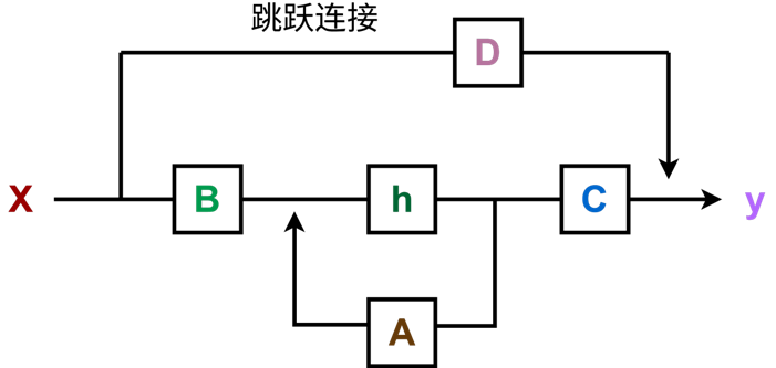 最后,经过状态映射和跳跃连接的信号整合,系统就会输出最终的结果y。