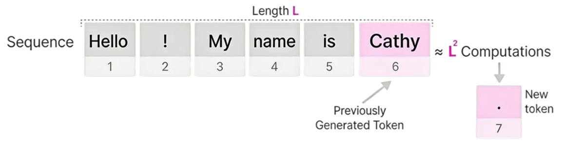 由于每次生成都需要对整个历史序列进行注意力计算,因此生成一个长度为L的序列所需的计算量大约与L²成正比,这导致了当序列变长时,推理成本会显著增加,成为Transformer模型在处理长序列时的一个关键瓶颈。