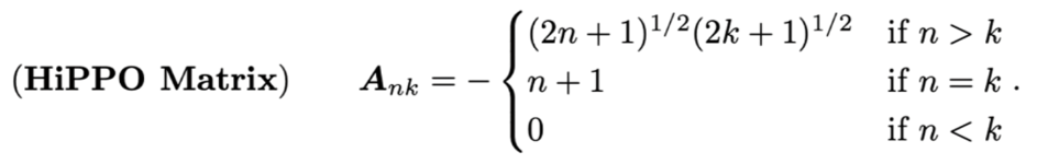 这个矩阵A定义为一个下三角矩阵,其元素的值由n(当前维度/时间尺度)和k(历史维度/时间尺度)的大小关系决定。当n>k时,元素为两个平方根的乘积,这建立了一种跨时间尺度的耦合,让模型能将更远的历史信息"投影"并整合到当前状态中;当n=k时,元素值随维度线性增长,这赋予了近期信息更强的权重;而当n<k时元素为0,确保了模型严格遵循因果性(当前状态只依赖过去,不依赖未来)。