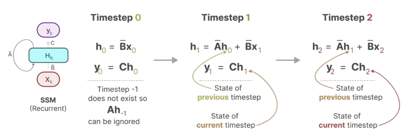 下图直观地展示了S4模型的循环(RNN)表示模式,这是其在推理阶段实现线性时间复杂度与低内存消耗的关键。
