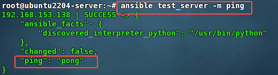 执行这条命令,如果出现"pong"说明客户端和server端建立连接成功:ansible test_server -m ping