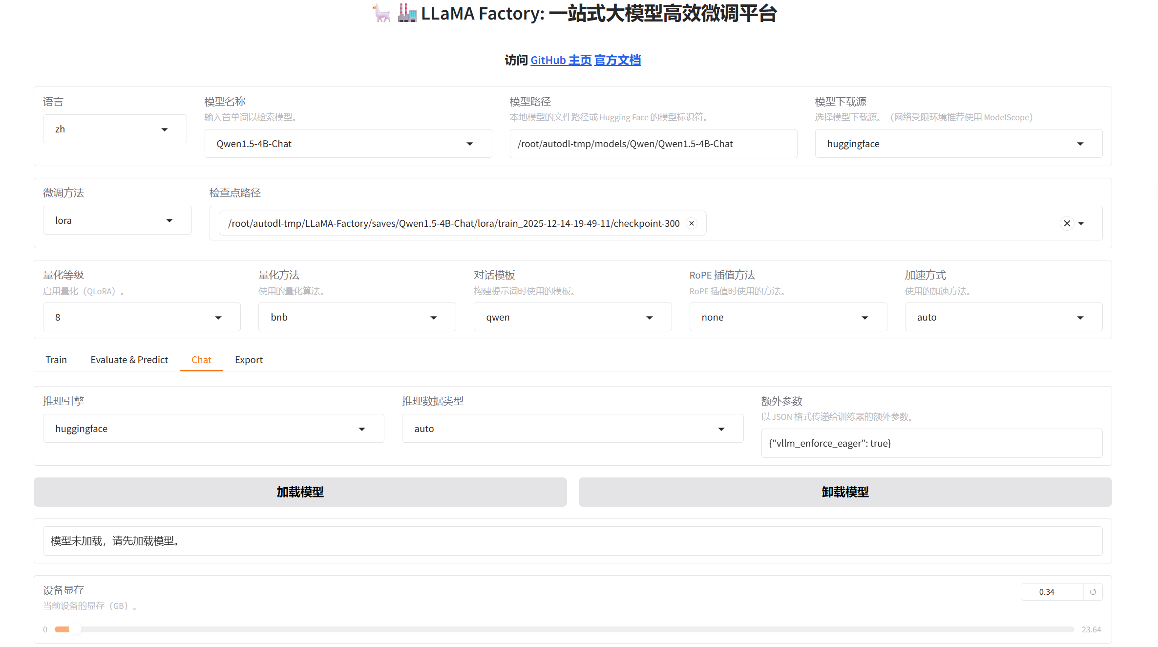 选择刚训练出的权重/root/autodl-tmp/LLaMA-Factory/saves/Qwen1.5-4B-Chat/lora/train_2025-12-14-19-49-11/checkpoint-300,放在检查路径,推理模型选择huggingface