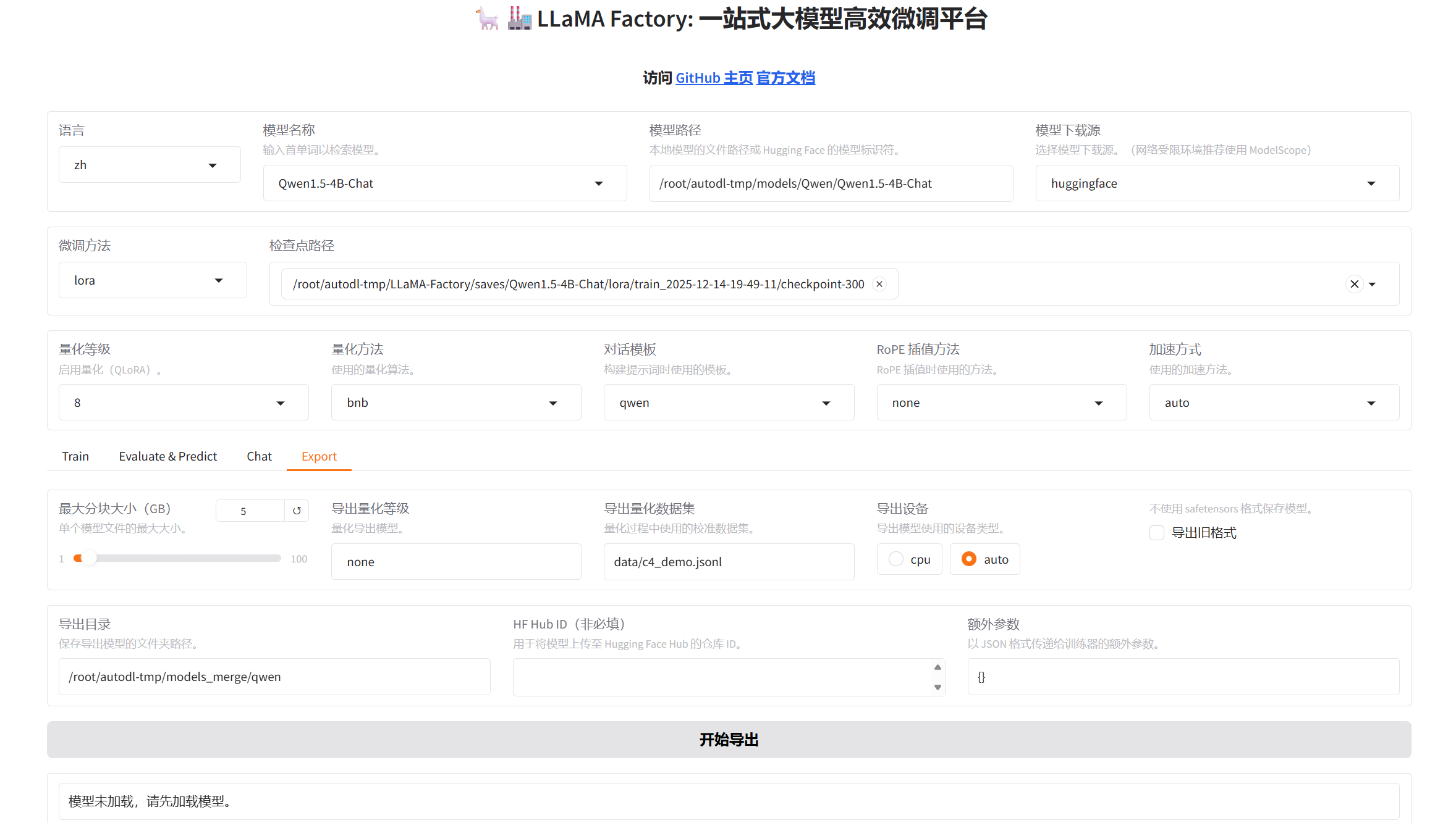 自创导出目录/root/autodl-tmp/models_merge/qwen,导出设备选择auto可以加快导出