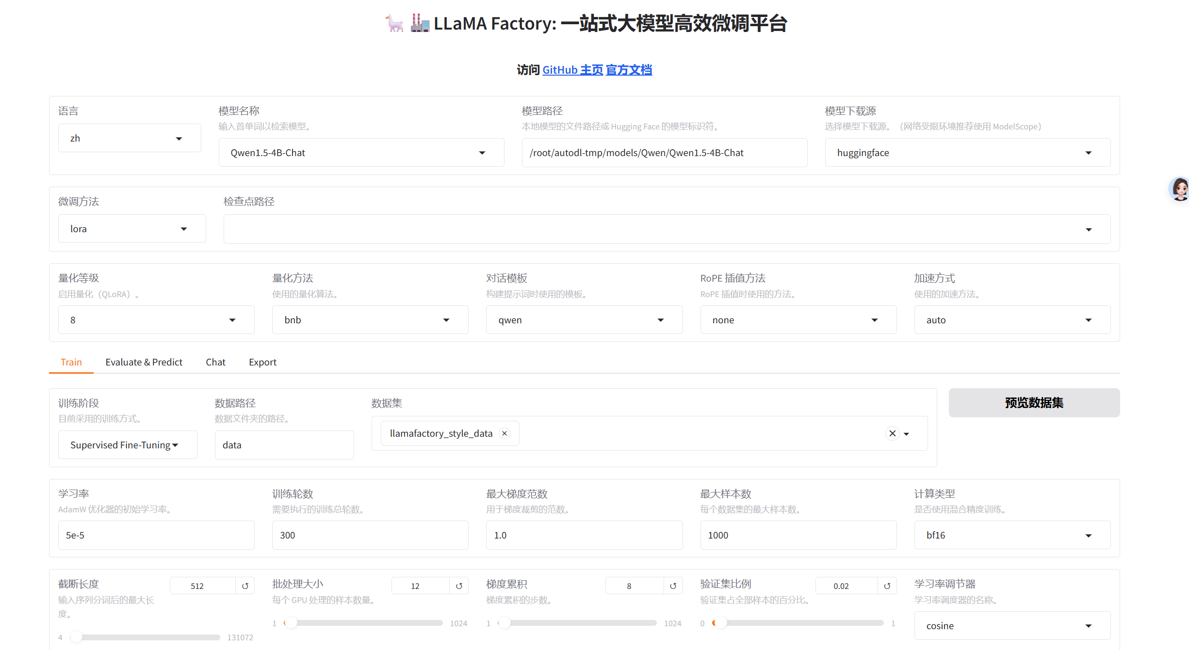 - 量化等级:8(可不开,缩小模型加速训练的)