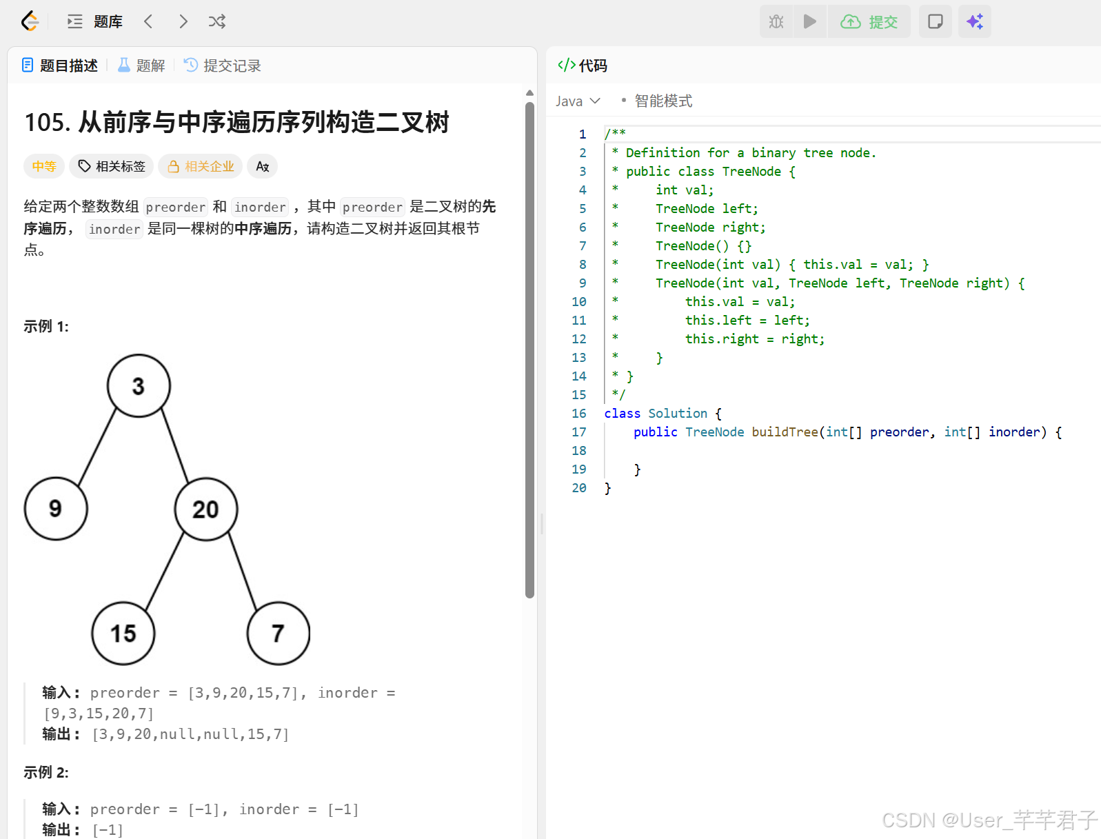 preorder:前序遍历数组;inorder: 中序遍历数组;成员变量 preIndex: 用于记录前序遍历中当前根节点的索引 (通过通过全局递增依次取前序序列的根节点)findVal 方法:查找根节点在中序序列中的索引rootIndex;递归方法buildTreeChild: