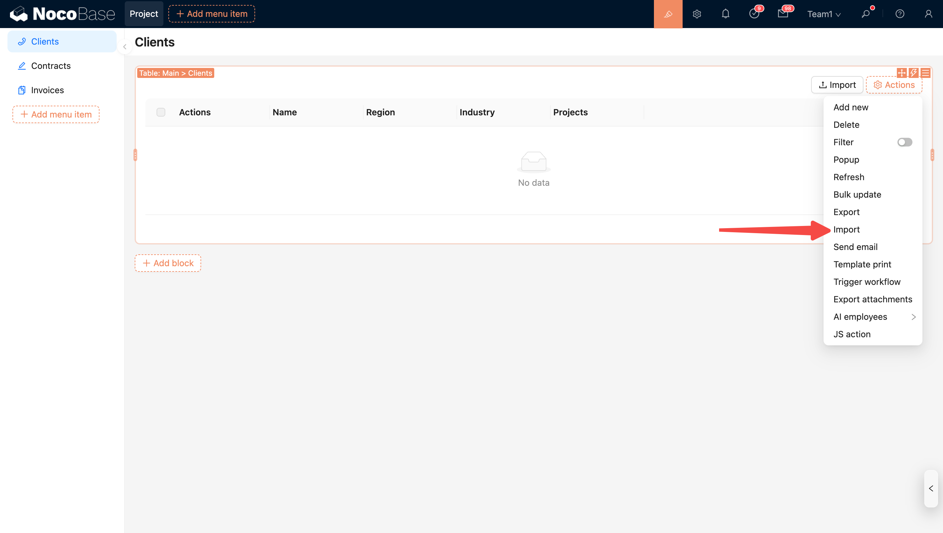 你会发现,现在还没有数据。点击区块右上角的"操作",添加"导入"。