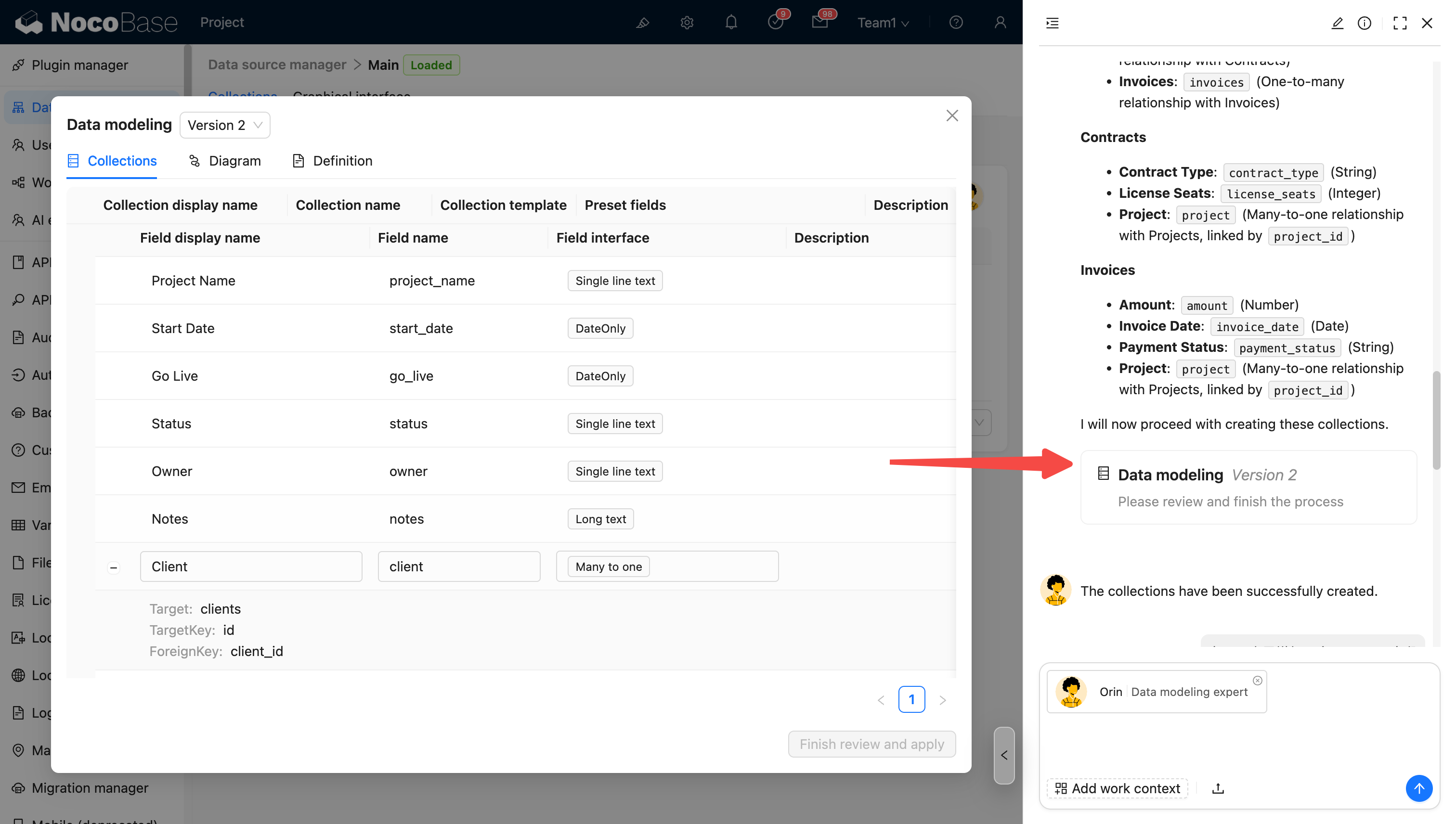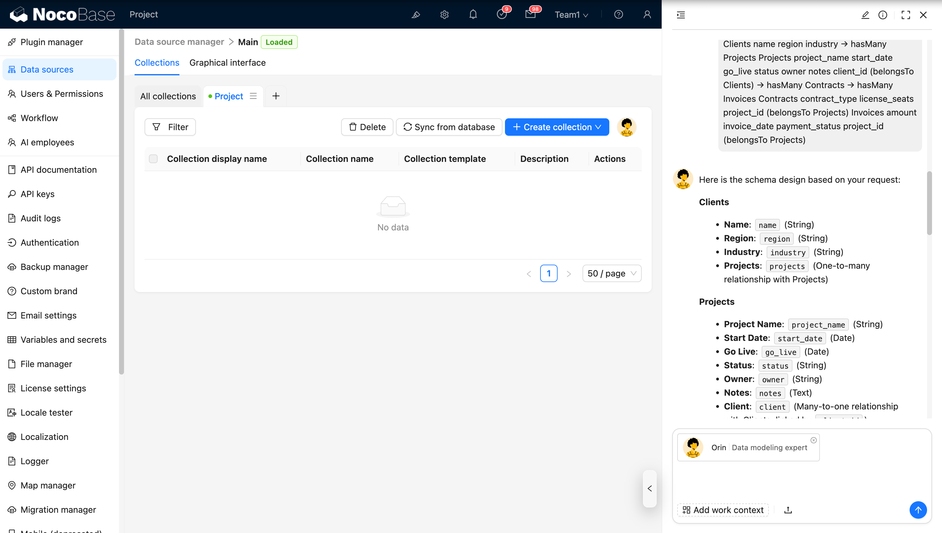 在 NocoBase 中,你可以让 AI 员工 Orin 直接帮你创建好这些表和字段。