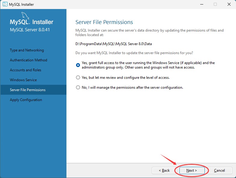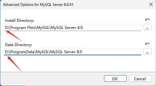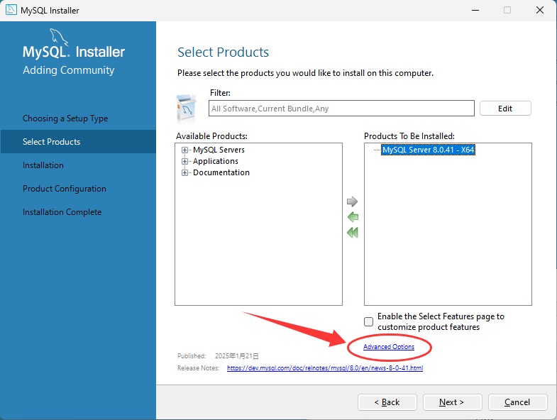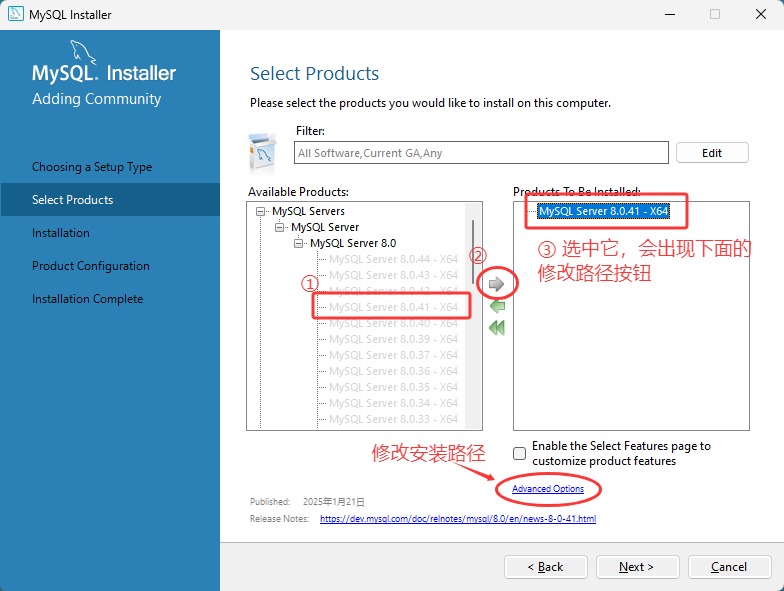 鼠标选中 MySQL Server 8.0.41-x64,点击"Advanced Options",将 MySQL 的安装路径改为其他盘(非系统盘):