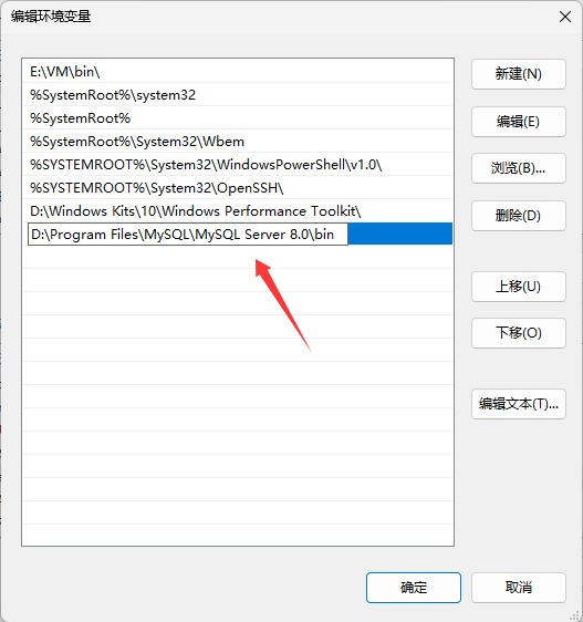 - 点击 "新建",将 MySQL 的安装路径下的 bin 目录(例如:D:\Program Files\MySQL\MySQL Server 8.0\bin)粘贴进去,点击 "确定" 保存设置: