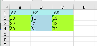 ['t1', 't2', 't3'], [['10', '11', '12'], ['20', '21', '22'], ['30', '31', '32']]);