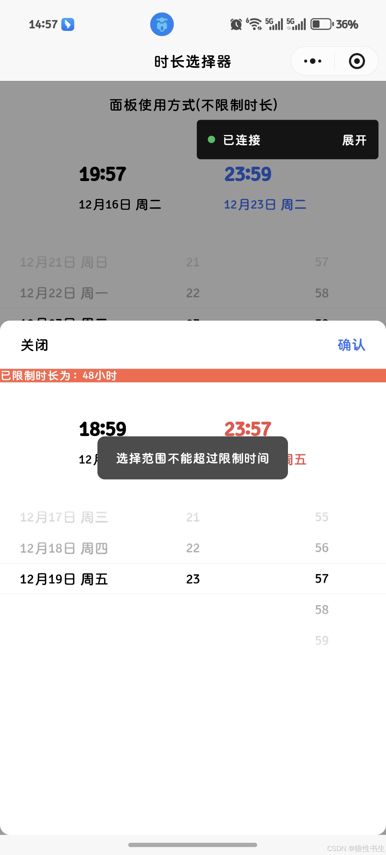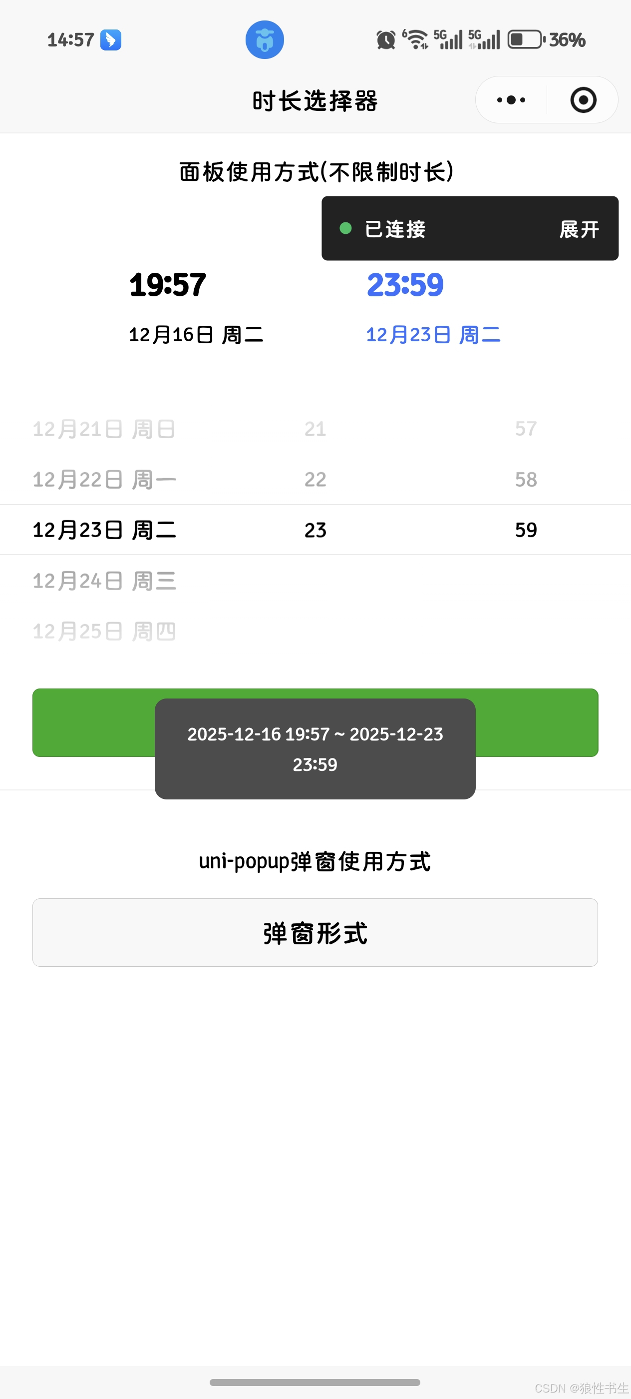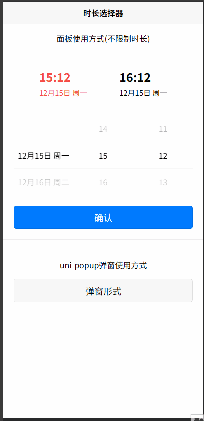 采用 uniapp 实现的一款时间范围选择器,不依赖任何第三方库,纯JS、CSS、HTML实现。支持 vue2、vue3;适配 web、H5、微信小程序(其他平台小程序未测试过,可自行尝试)