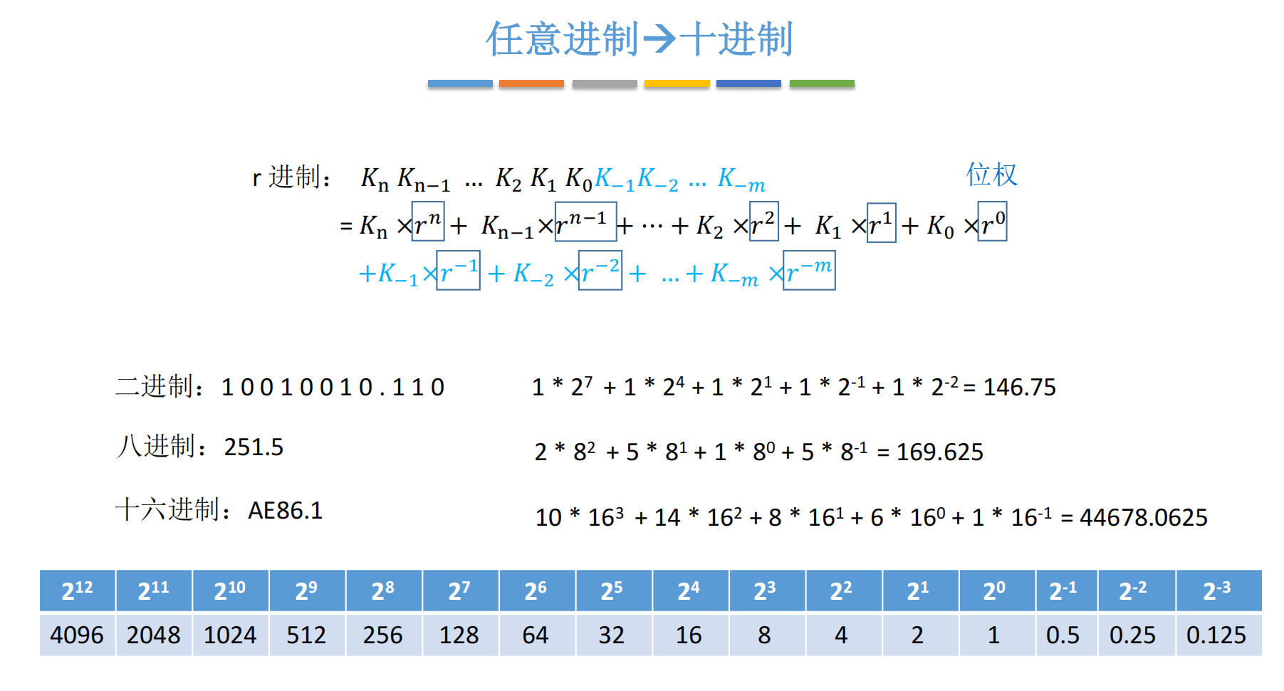 二、任意进制 →\rightarrow→ 十进制(按权展开法)