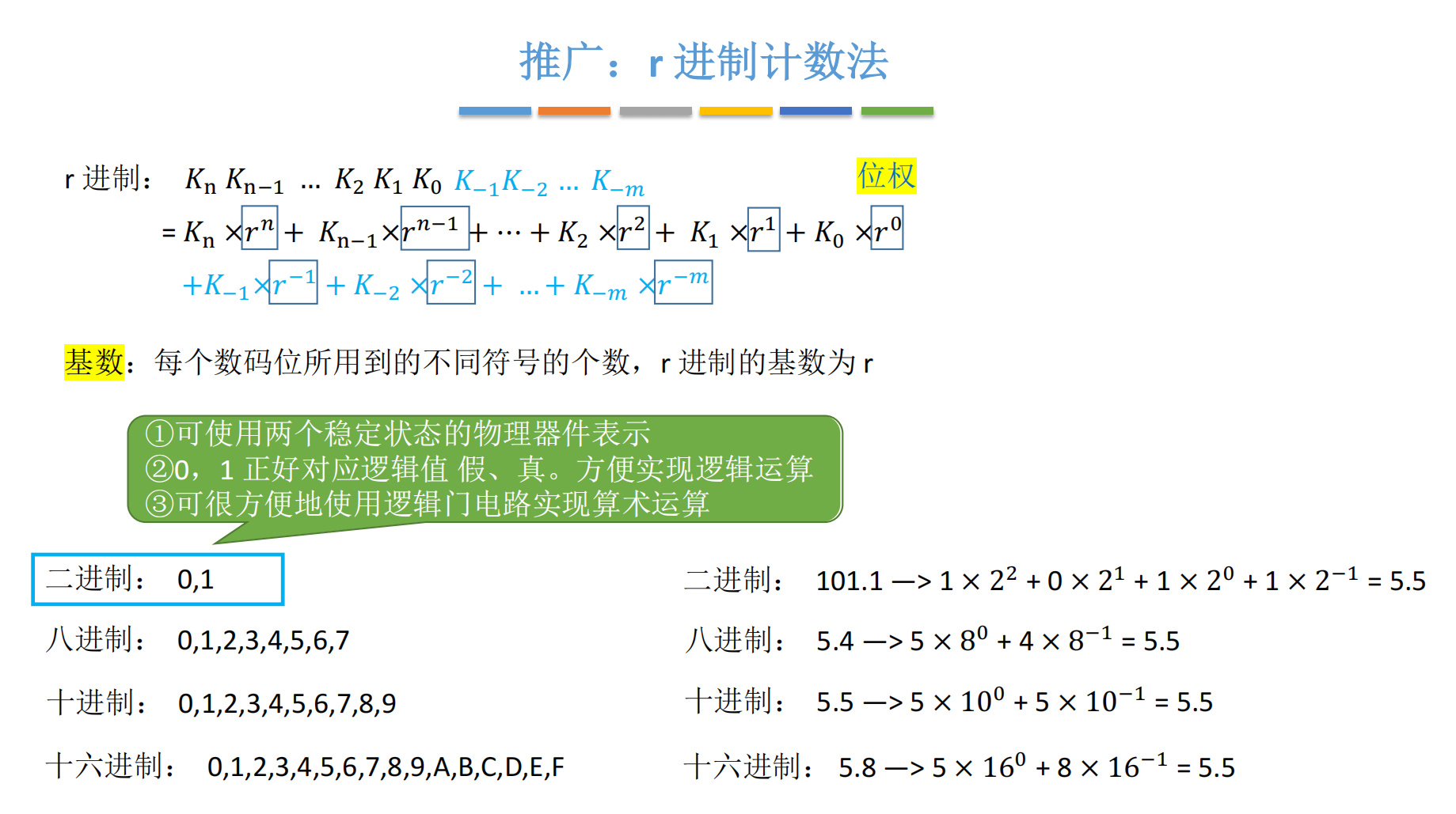 所以我们可以将十进制的逻辑推广到任意进制(R进制)。每一个数码位所用到的不同的符号的个数,就是所谓的基数。比如说十进制,在每个数码位有可能用到的符号会有012一直到9,总共有十种符号。那对于一个r进制的数来说,它的奇数就应该是r,也就是有可能会出现r种不一样的符号。