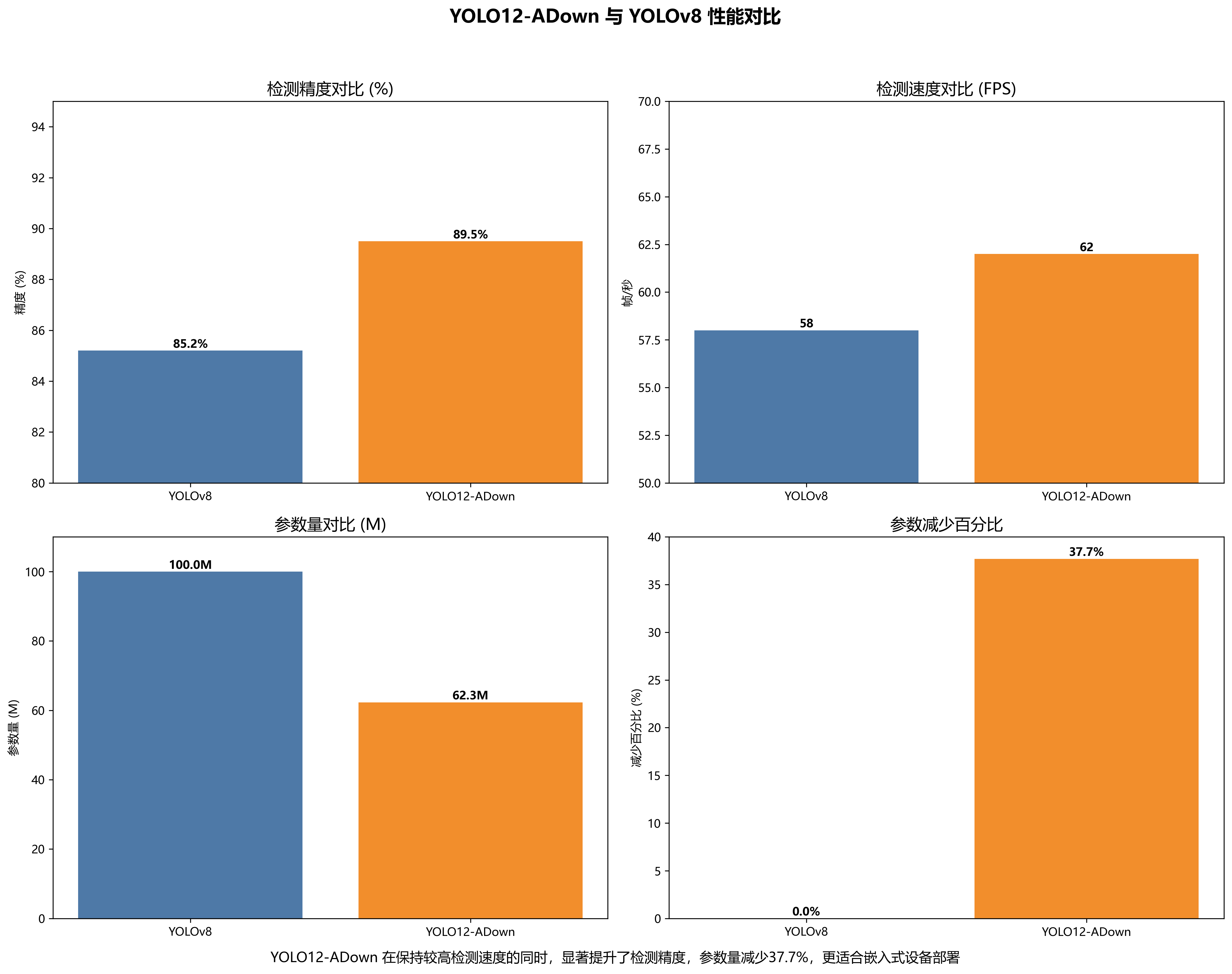 从表中可以看出,YOLO12-ADown在保持较高检测速度的同时,显著提升了检测精度。特别是在参数量方面,YOLO12-ADown比YOLOv8减少了37.7%,更适合在嵌入式设备上部署。这种精度和效率的平衡使得YOLO12-ADown在实际应用中具有更大的优势!💪