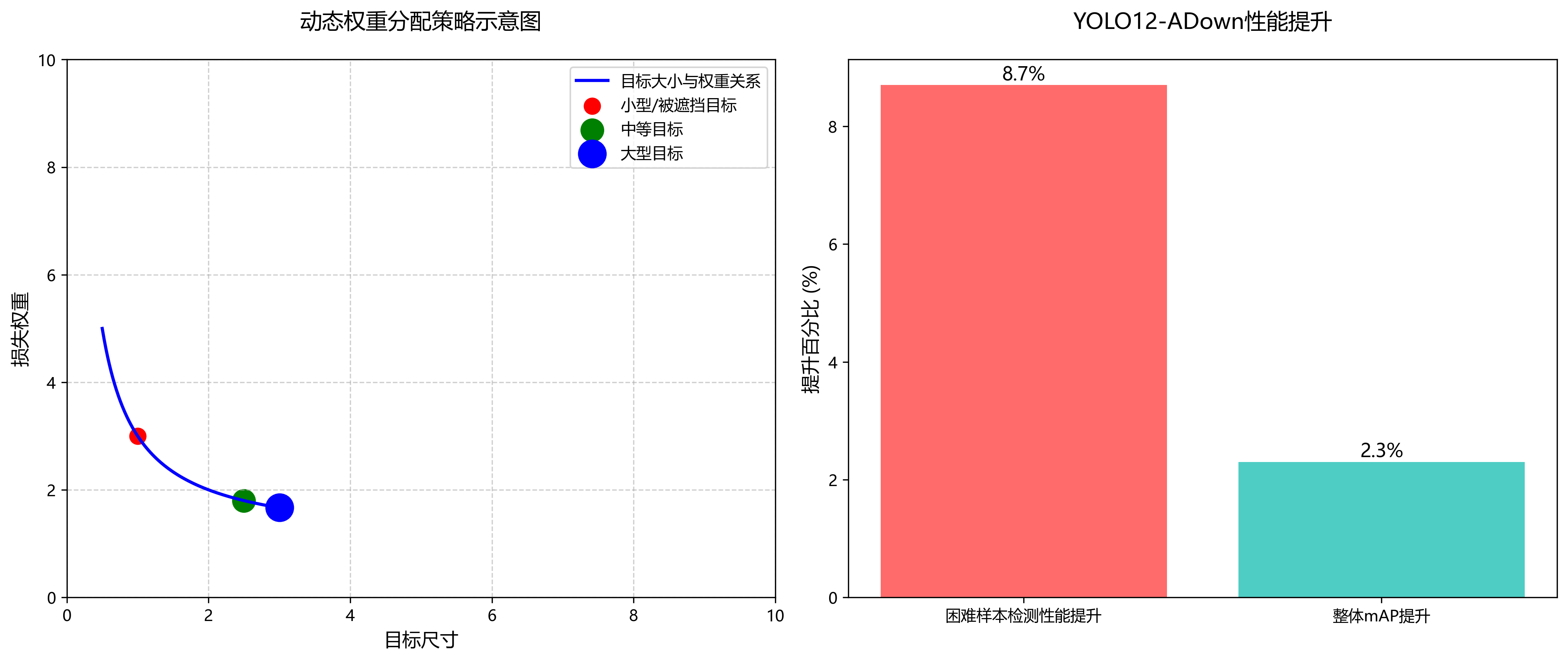 此外,YOLO12-ADown还引入了动态权重分配策略,根据目标的大小和位置自动调整不同损失项的权重。这种设计使得模型能够更关注难检测样本,如被遮挡或远距离的小型两轮车辆。实验数据显示,这种动态权重策略在困难样本上的检测性能提升了8.7%,整体mAP提升了2.3%,是一个相当显著的改进!📈