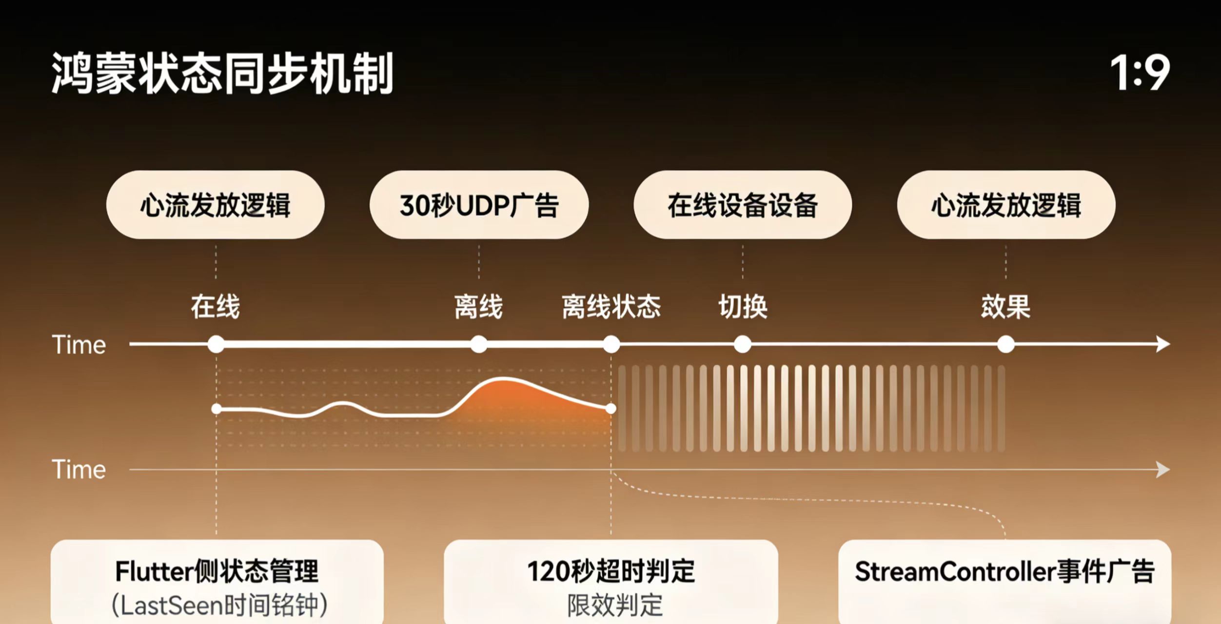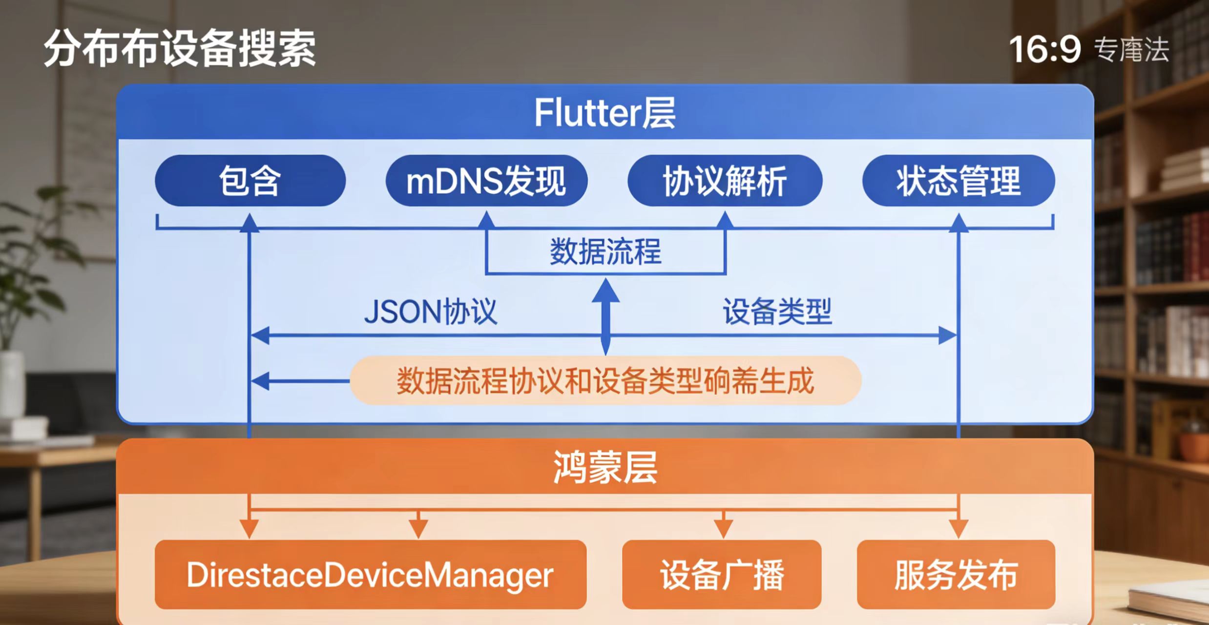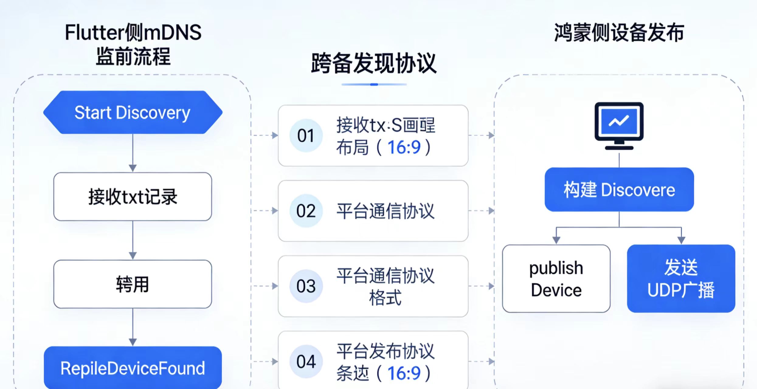 Flutter侧通过dart:io和mDNS插件实现局域网设备发现,鸿蒙侧使用DistributedDeviceManager进行设备组网。两端通过自定义JSON协议进行通信,设备类型标识采用manufacturer+model的MD5哈希值来确保设备唯一性。