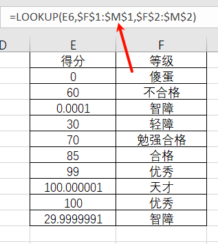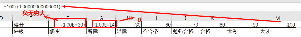 其余分数对应的等级单元格为该公式下拉得出。可见0分现在成了傻蛋,0.0001分就成了更高等级的智障,而100对应的等级已经成了比天才低一等级的优秀,100.000001对应的等级则是更高等级的天才。