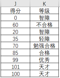 Excel中经常会遇到根据得分得到相应的评级的问题,例如:0≤得分<30为智障,30≤得分<60为轻障,60≤得分<70为不合格,70≤得分<80为勉强合格,80≤得分<90为合格,90≤得分<100为优秀,≥100为天才,可以据此做出如下评价表: