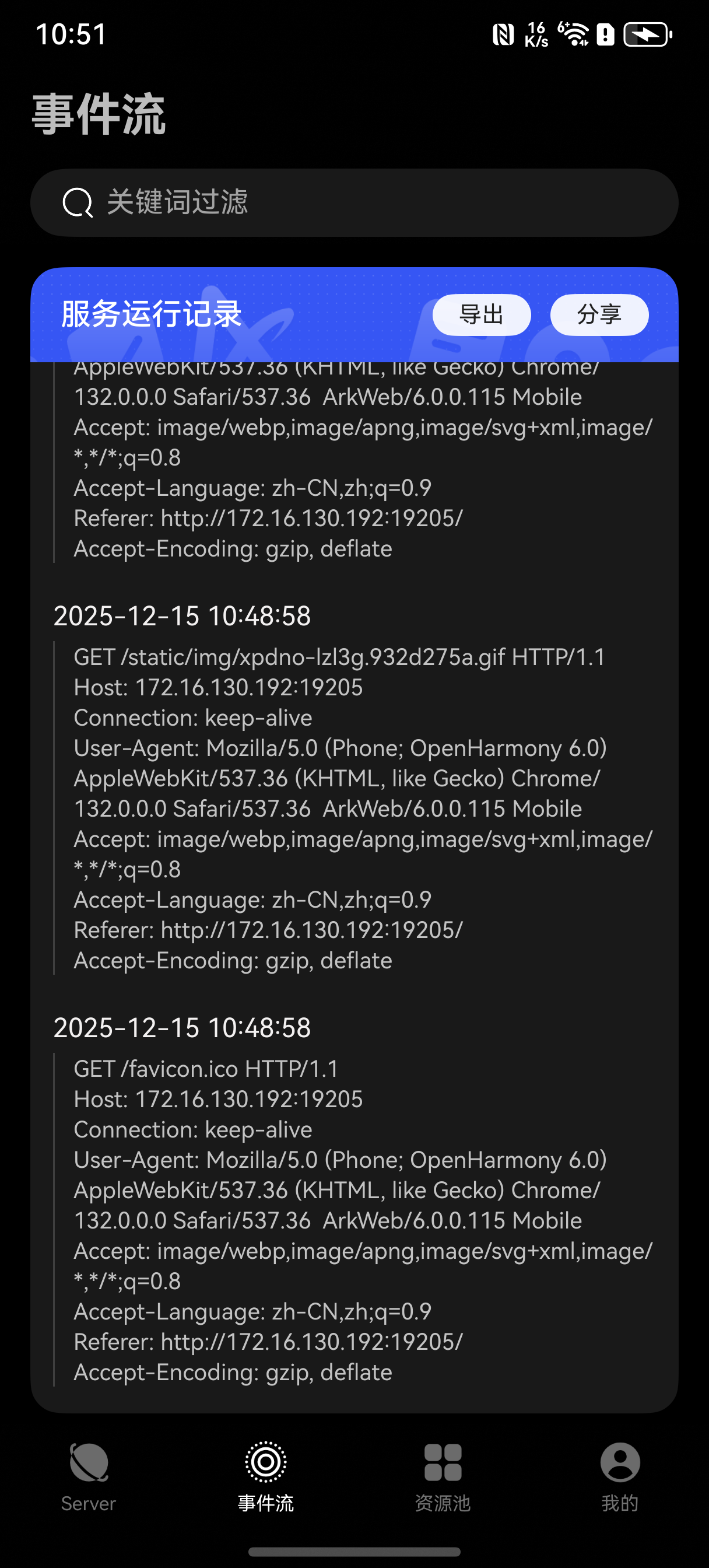 事件流支持关键词过滤,快速定位异常请求或路径错误。日志可以本地保存或分享,非常适合调试、复盘和团队协作。对开发者来说,这比"访问失败但不知道为什么"强太多。
