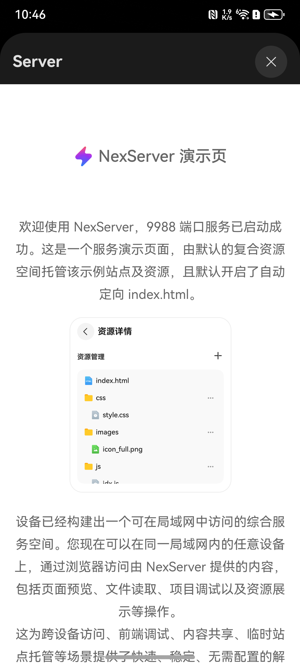 NexServer 的目标很直接:让鸿蒙设备瞬间具备本地 Web 服务能力,而且不需要任何编译、构建或环境准备。
