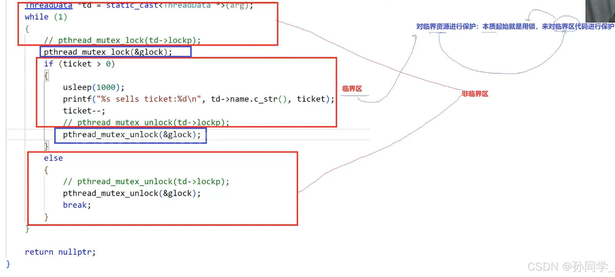 - 临界区: 每个线程内部,访问临界资源的代码,就叫做临界区