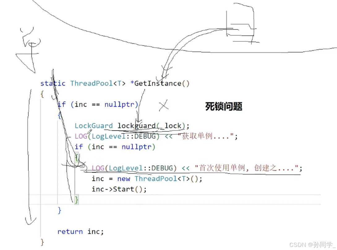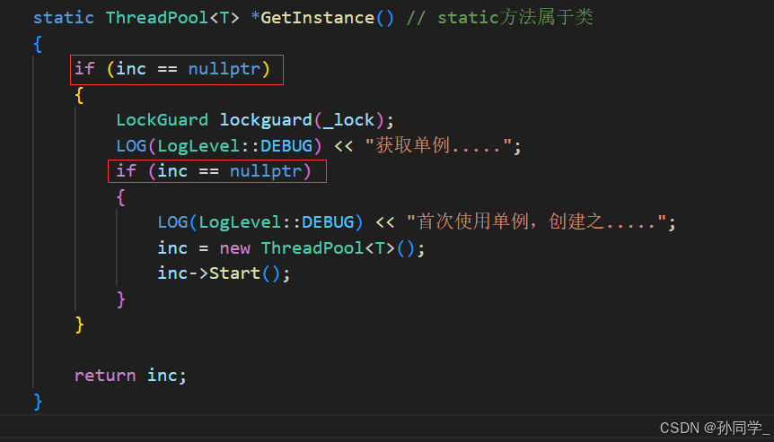 如果有多个线程并发的进来了,如inc不为空,直接返回单例。如果inc为空,说明这个对象还没有创建出来,进来之后首先要加锁,加锁之后只有一个线程创建单例成功。从此往后所有线程再获取单例时,inc==nullptr不满足,直接返回,再也不用加锁了,采用双重判断的方式提高获取单例的效率。