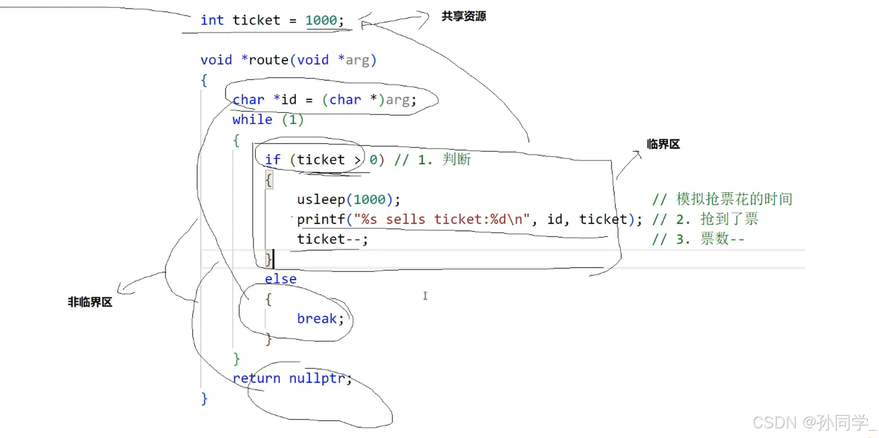 一个整数并不是原子的,在c语言ticket--操作时,c语言会被转化成三条汇编,三条汇编之间任意一个位置都有可能发生线程中断切换,然后换入下一个线程,又因为线程之间资源是共享的,所以ticket--并不是原子的。