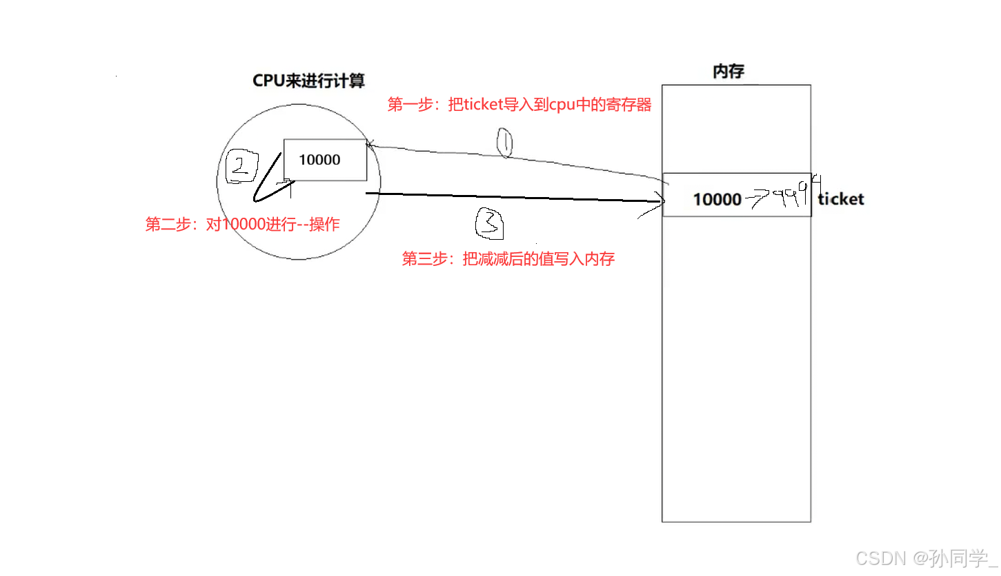 可能有人会说,ticket--不是一条语句吗?答案是ticket--是c语言,C语言是要变成汇编语言的,汇编语言就会把c语言的ticket--操作转化为上面的三步。