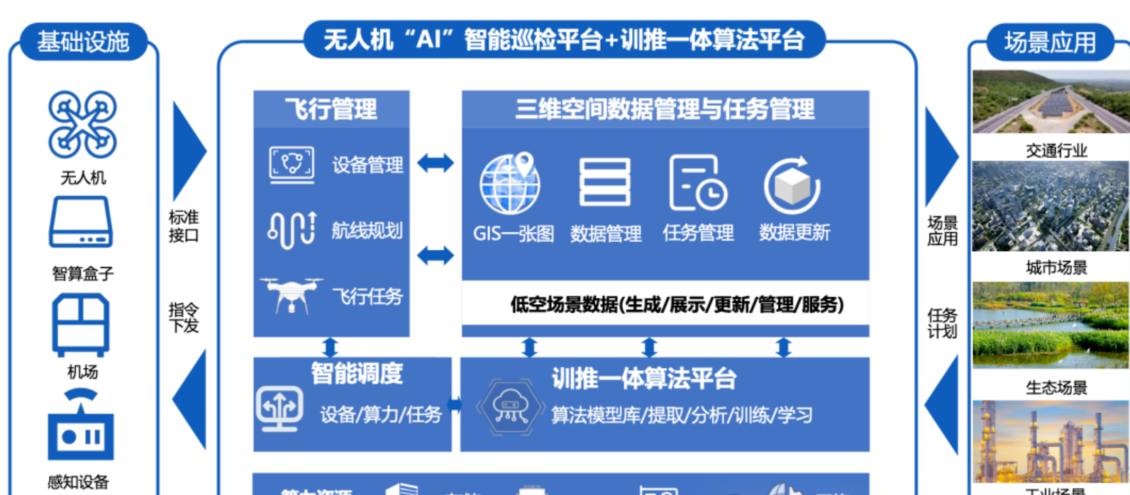 能力解耦,场景赋能:将多场景适用的飞控、视频与感知技术封装为标准化服务接口,向千行百业开放;为政务巡检、物流运输、应急救援、文旅体验等提供空域、气象等情报服务和安全保障。