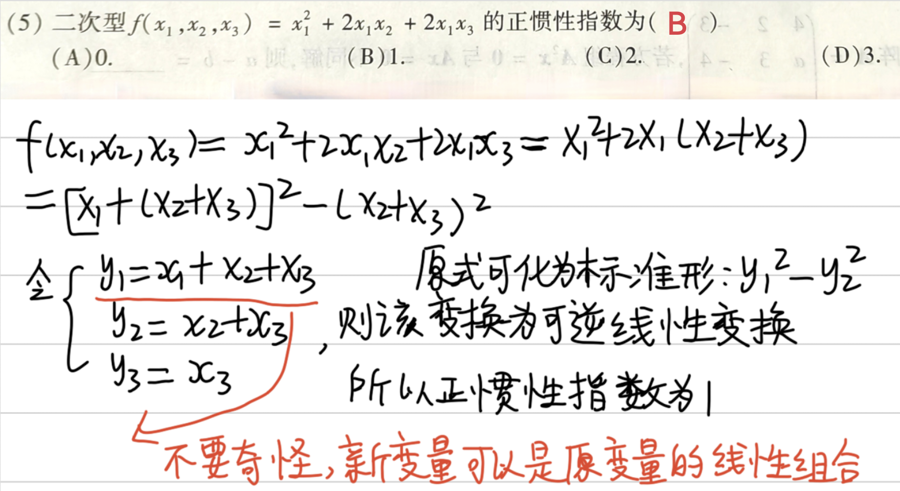 惯性定理指出,无论你通过何种可逆线性变换将二次型化为规范形,正惯性指数 p 和负惯性指数 q 都是固定不变的 。并且,两者之和等于二次型的秩(r),即 p + q = r 。
