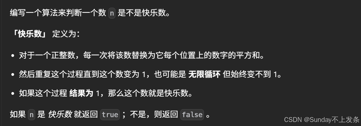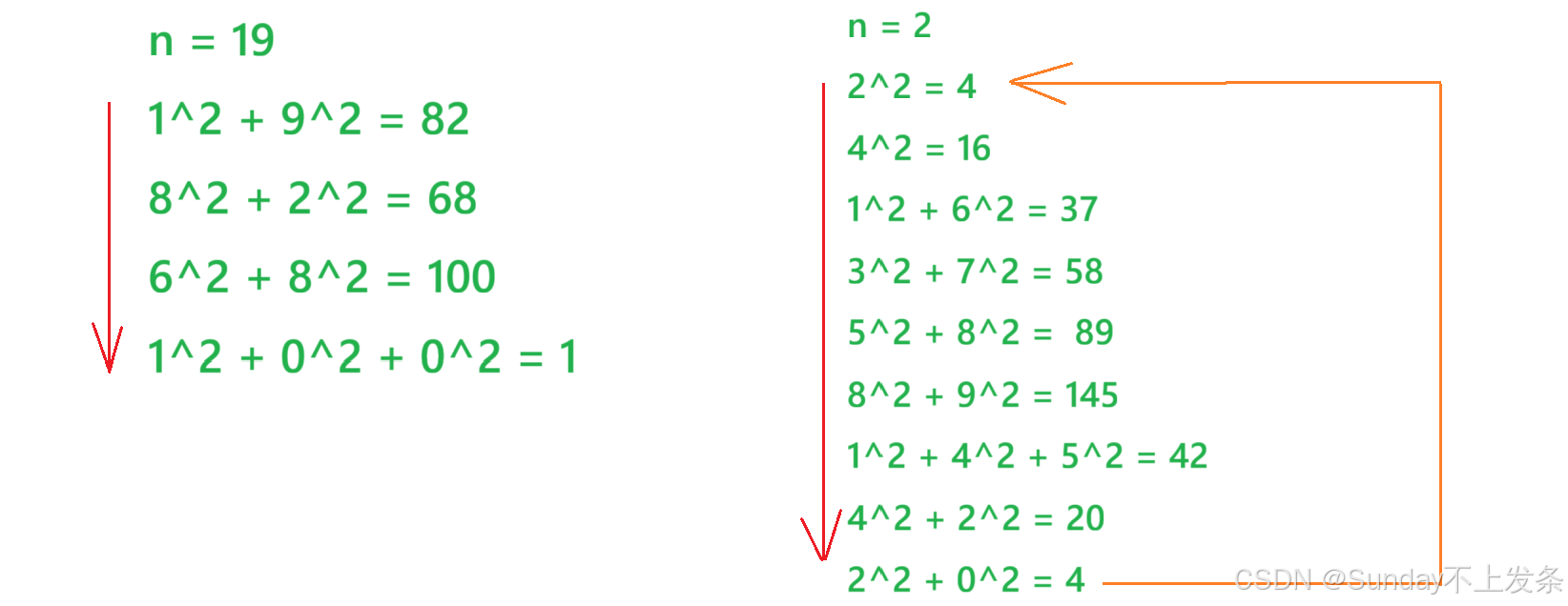 对于n = 19,经过求和后,最终结果变为了1,即19为快乐数;n = 2,经过求和,最终又回到了起点。