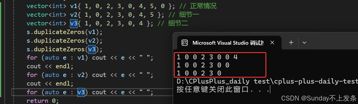 vector<int> v2{ 1, 0, 2, 3, 0, 4, 5 }; // 细节一