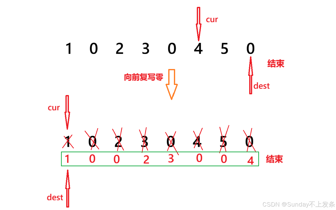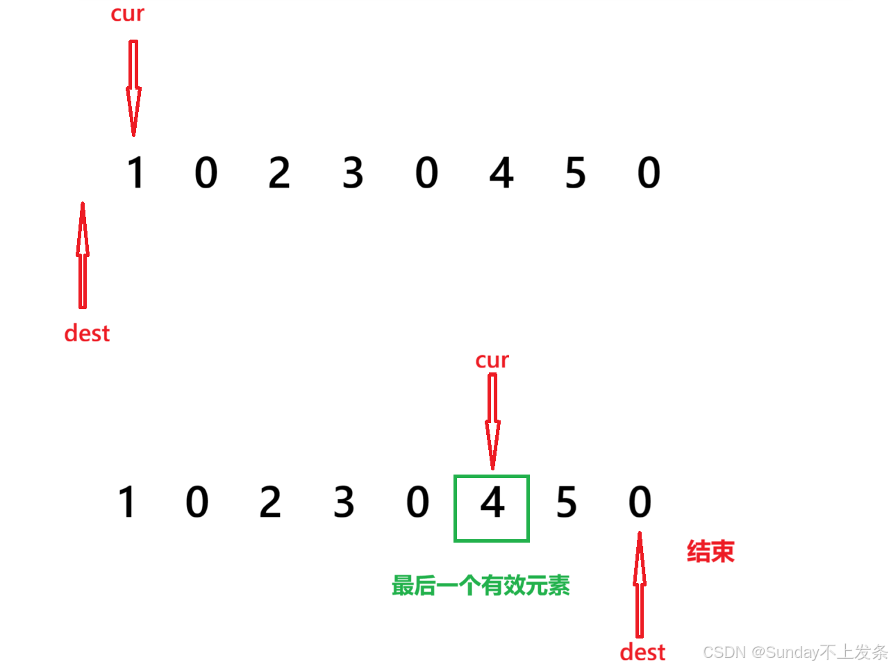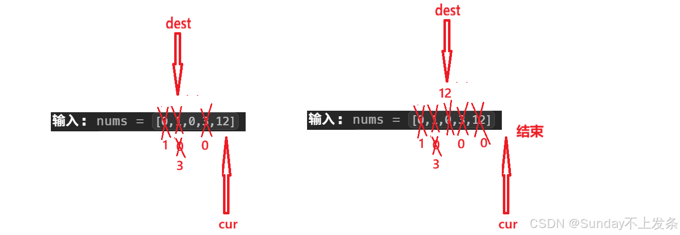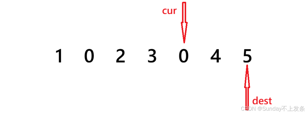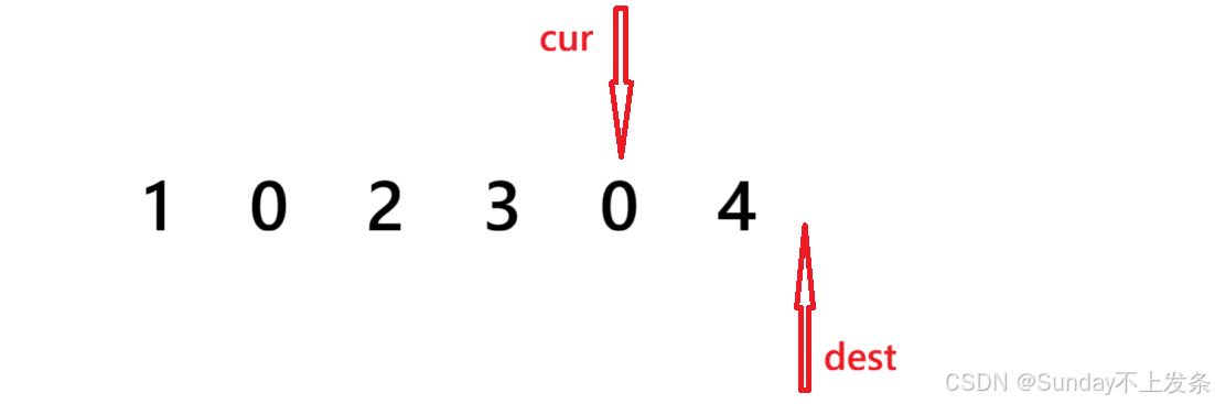 (1)刚开始让一个指针cur 先指向数组的第一个元素,另一个指针 dest 初始化为 -1。cur 用来找非零元素,dest 用来确定 cur 之前的 0 元素。