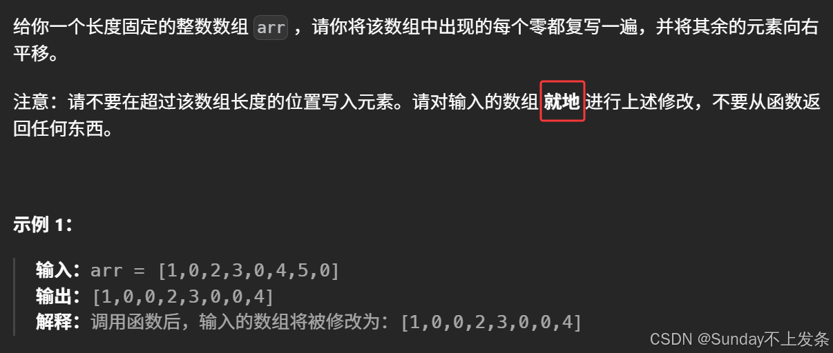 当cur 指向最后一个有效数据且为 0 时,dest 需要向后移动两次,但是数组空间大小只剩下一个位置,即dest 出了数组。意味着我们在先前复写零时,cur 指向的这个 0 元素只能复写一次,所以,我们需要单独处理。