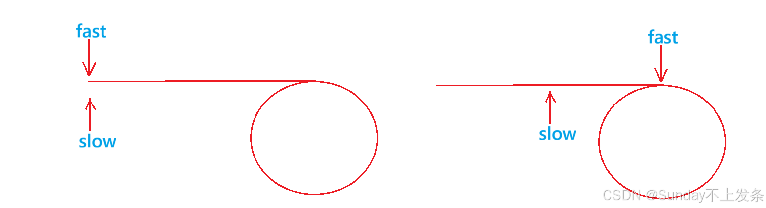 假设慢指针一次走一步,快指针一次走两步,那么快指针一定先入环,但由于两者的速度差,最终肯定会相遇(结束条件)。
