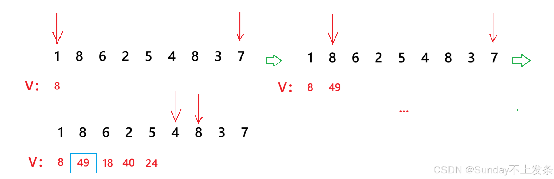 解法二: 对撞指针(左右指针),left 和 right 指针向右向左找符合的桶(区间)。主要是依靠单调性,当left 和 right 向内移动时,宽度一定是变短的,体积 V = 宽度 * 高,所以要想找到最大的体积,只能依靠找到更大的高度。