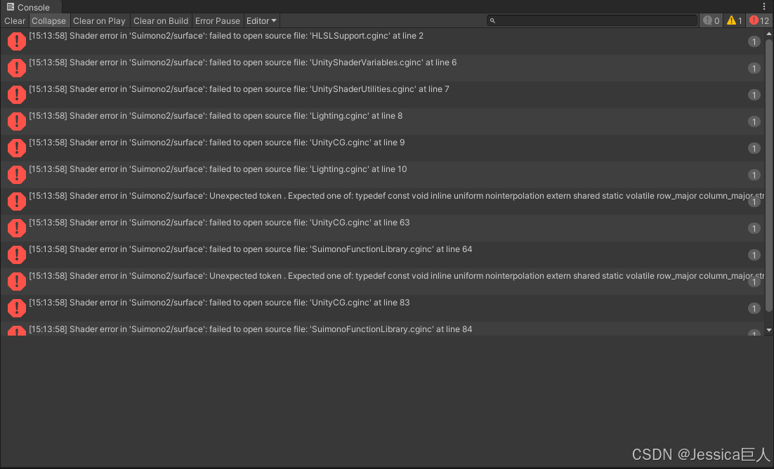 从控制台日志来看,Suimono2/surface Shader无法找到多个内置.cginc文件(如UnityCG.cginc、Lighting.cginc),这些文件是Unity编译Shader的基础依赖库。由于其他工程正常,排除Unity安装问题,故障可能源于当前工程的缓存损坏或Shader引用路径错误。
