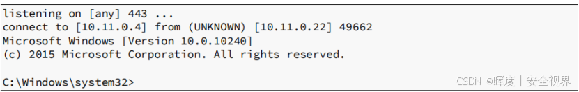 | ① 监听准备 | 在Kali上启动Netcat监听443端口 | nc -nlvp 443 |